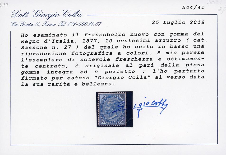 1877 - 10 cent. azzurro (27), ottima centratura, nuovo, gomma originale integra, perfetto. Molto bello, raro in queste condizioni. ... Leggi tutto