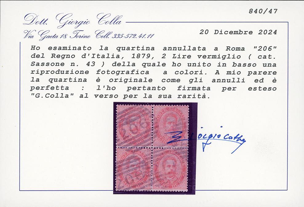 1879 - 2 lire vermiglio, Umberto I (43), eccezionale blocco di quattro, perfetto, annullato con il numerale a sbarre 206 di Roma. Molto raro e di ottima qualità. Cert. Colla.