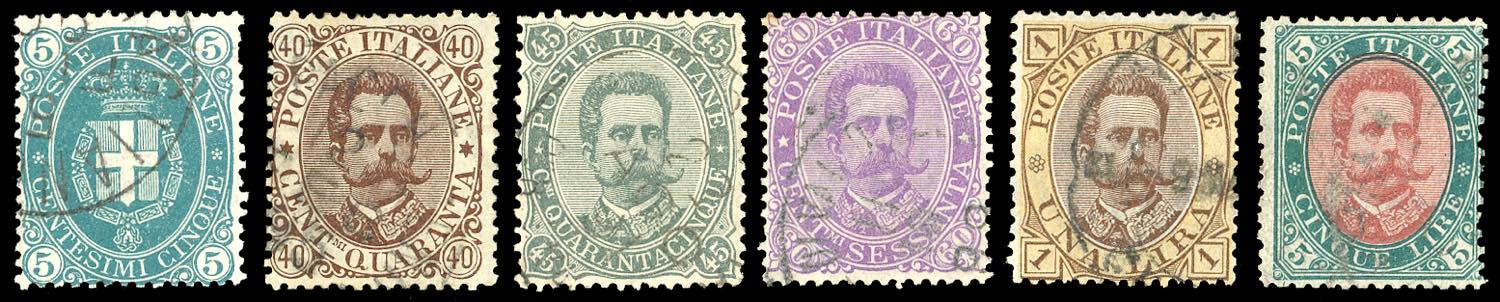 1889 - Umberto I, seconda emissione, serie completa (44/49), usati, perfetti. Cert. Diena per il 5 lire.