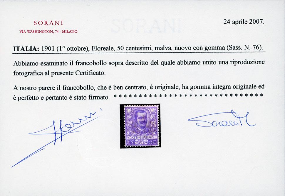 1901 - 50 cent. Floreale (76), nuovo, gomma originale integra, perfetto, molto fresco e ben centrato. R.Diena e cert. Sorani.