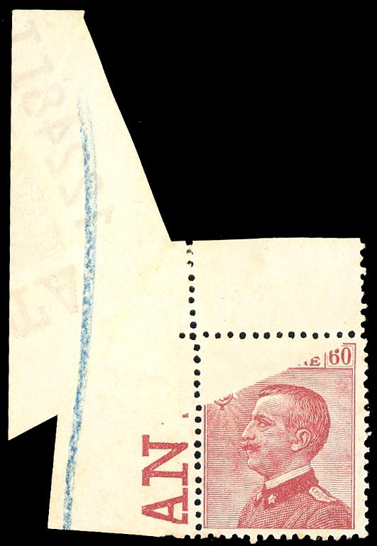 1918 - 60 cent. Michetti (111), stampa parziale dovuta ad un'anomala piegatura del foglio al momento dell'impressione, la stampa è presente al verso dell'angolo di foglio, con il numero di tavola, nuovo, gomma originale integra, perfetto. Splendida varietà di grande effetto visivo. Insieme probabilmente unico. E.Diena, Ferrario.
