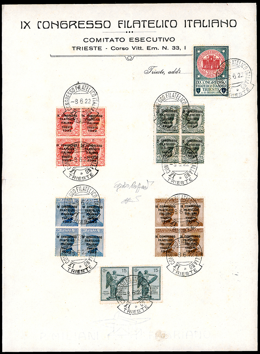 1922 - Congresso Filatelico, soprastampati, serie completa (123/126), blocchi di quattro, perfetti, usati su foglio ufficiale intestato del "IX Congresso Filatelico Italiano", unitamente allo speciale erinnofilo della manifestazione ed una coppia 15 cent. Vittoria (121), tutti annullati con il bollo speciale di Trieste dell'8 giugno 1922. Insieme spettacolare ed estremamente raro. Da esposizione. Cert. Caffaz e Ferrario.
