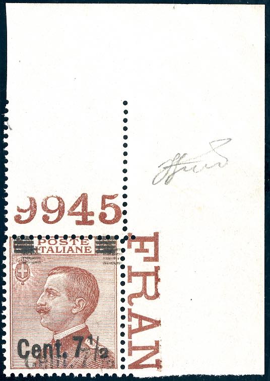 1927 - 7 1/2 su 85 cent. Michetti, doppia soprastampa del II tipo (136b nota), angolo di foglio superiore destro con numero di tavola 9945, ... Leggi tutto
