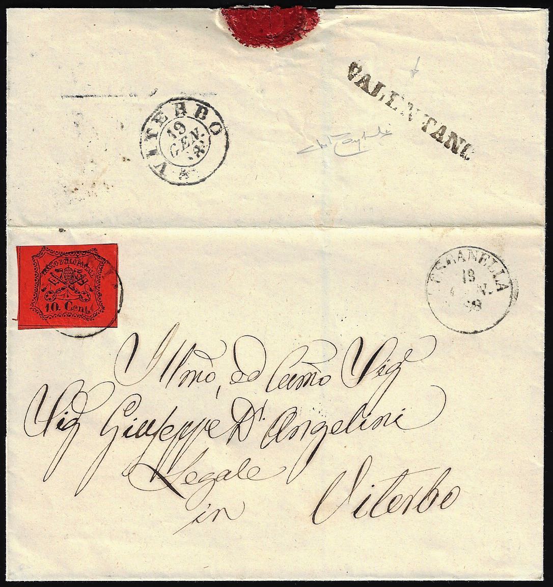 VALENTANO, punti 13 - 10 cent. (17), perfetto, su sovracoperta di lettera, annullato in transito a Toscanella 18/1/1868, per Viterbo. Molto bella! Ex. Coll. Andreotti. Raybaudi.