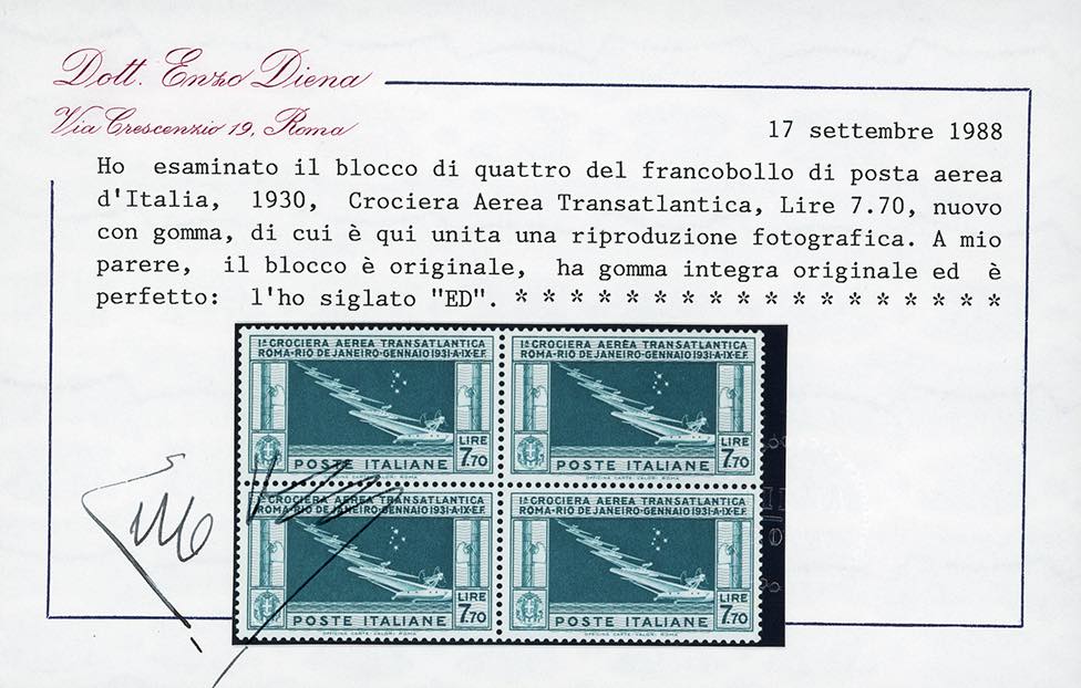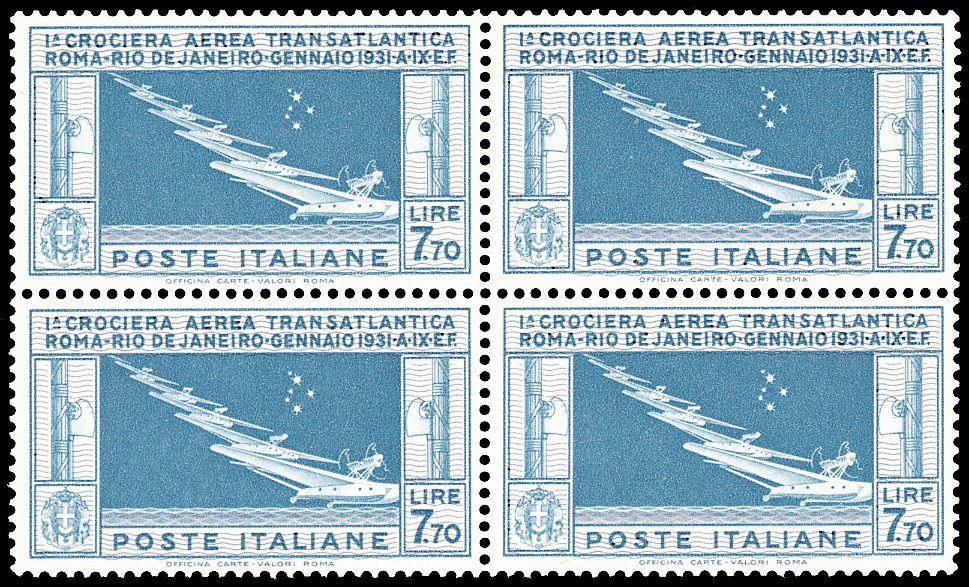1930 - 7,70 lire Crociera Balbo (25), buona centratura, blocco di quattro, gomma originale integra, perfetto. Cert. E.Diena e Oro Raybaudi (cat.Sassone € 6.500/8.125).
