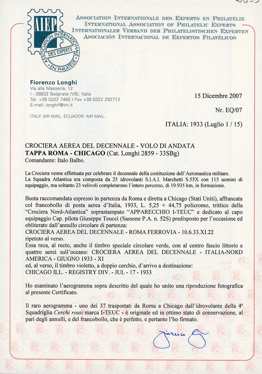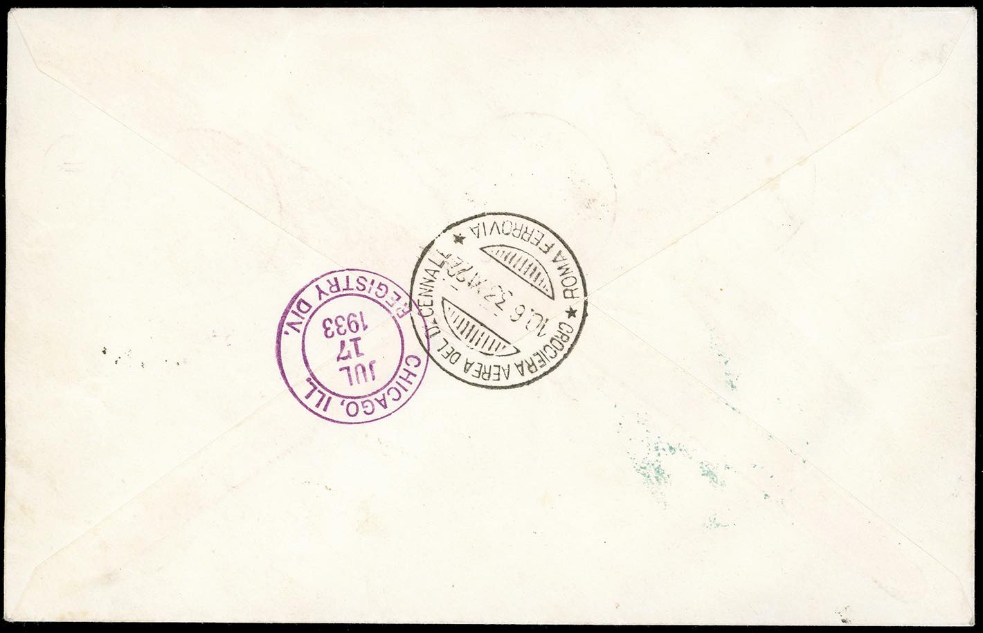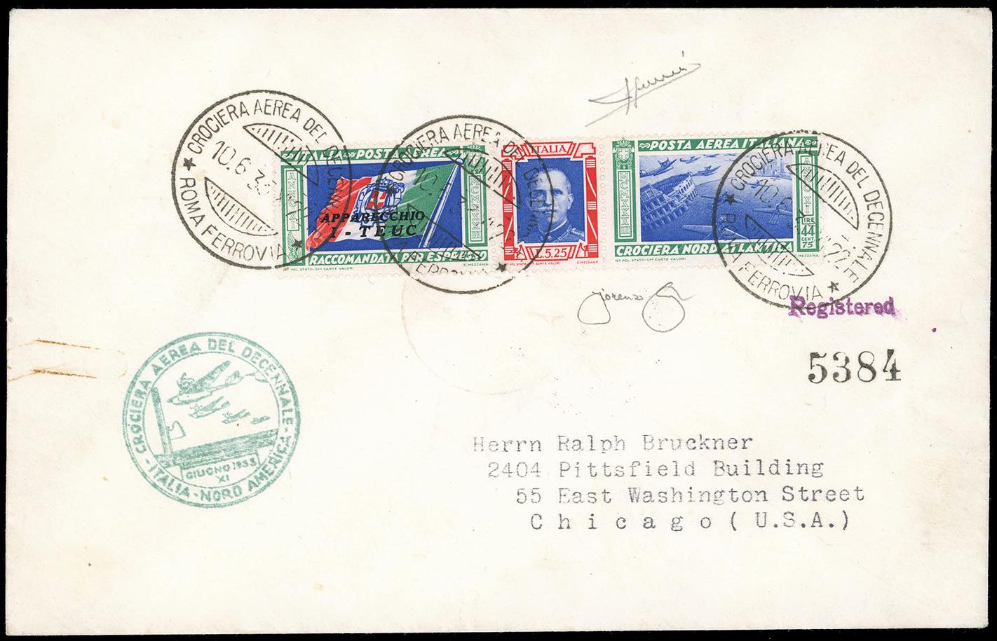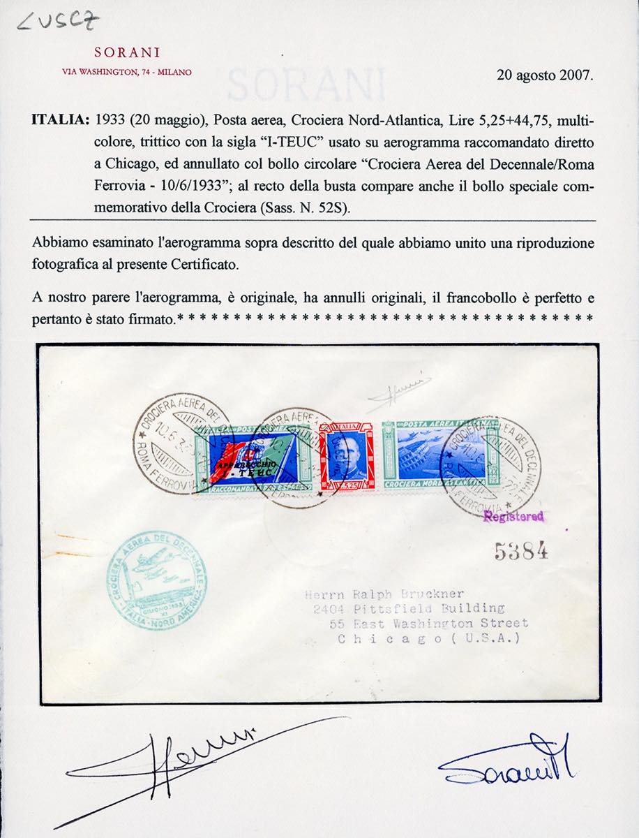 1933 - 5,25 + 44,75 lire Trittico I-TEUC (52S), perfetto, su aerogramma raccomandato da Roma 10/6/1933 a Chicago, bollo di arrivo al verso e bolli speciali della Crociera. E' uno dei migliori tra i 37 trasportati sull'I-TEUC. Dettagliato cert. Longhi e cert. Sorani.