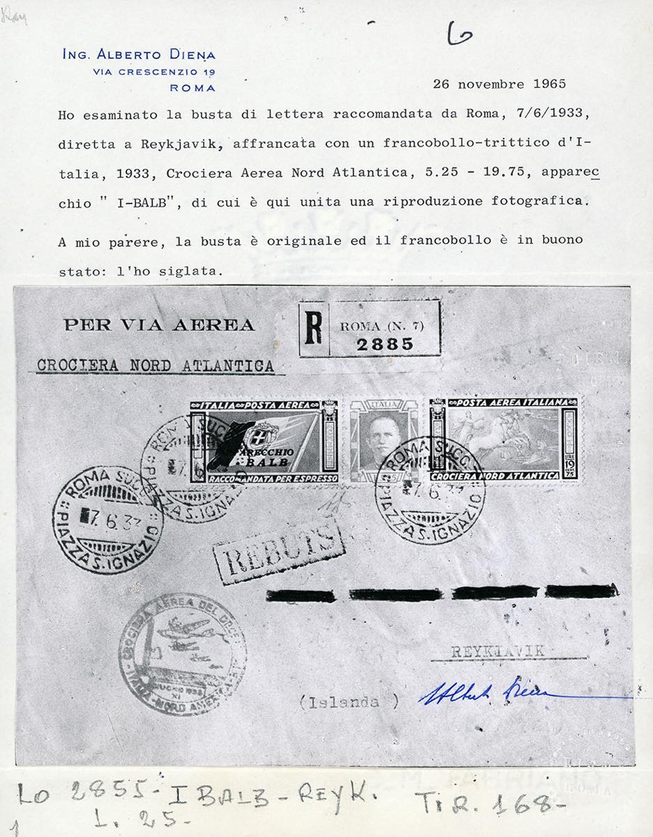 1933 - 5,25 + 19,75 lire Trittico I-BALB (51A), ottimo stato, su aerogramma raccomandato da Roma 7/6/1933 a Reykjavik, in Islanda, bollo di arrivo al verso, bolli speciali della Crociera sul fronte e al verso. Cert. A.Diena.