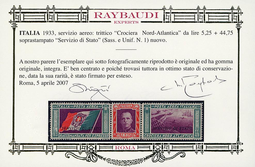 1933 - 5,25 + 44,75 lire Trittico Servizio di Stato (1), ben centrato, nuovo, gomma originale integra, perfetto. Ottima qualità. Cert. Oro Raybaudi.