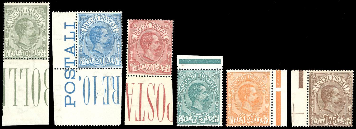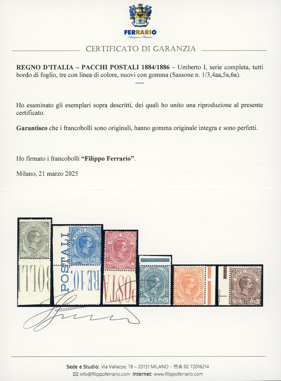 1884/86 - Umberto I, serie completa, tutti bordo di foglio, tre con linea di colore (1/3,4aa,5a,6a), nuovi, gomma originale integra, perfetti e molto freschi. Ottima qualità. Cert. Ferrario.