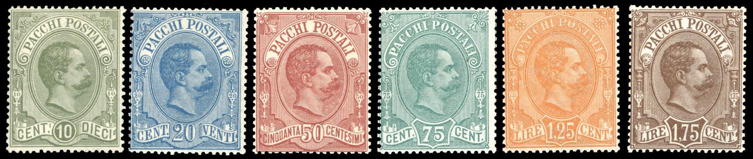 1884/86 - Umberto I, serie completa (1/6), discreta centratura, gomma originale, impercettibile traccia di linguella, perfetti. Belli. ... Leggi tutto
