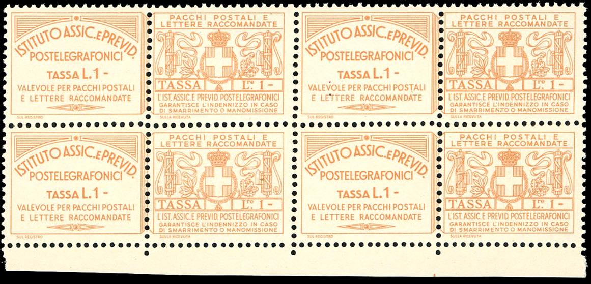 1936 - 1 lira Istituto Assicurazioni (13), blocco di quattro, bordo di foglio, nuovo, gomma originale integra, perfetto. Molto fresco. Ferrario.