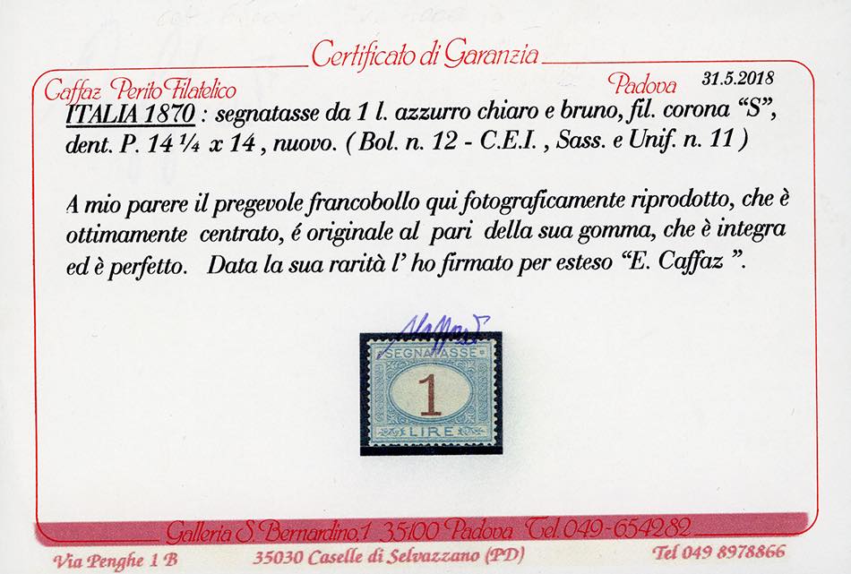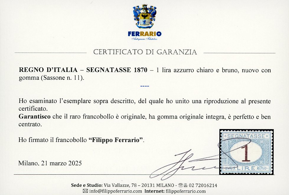 1870 - 1 lira azzurro chiaro e bruno (11), ben centrato, nuovo, gomma originale integra, perfetto. Molto bello e raro di questa qualità. Cert. Diena, Caffaz, Ferrario.