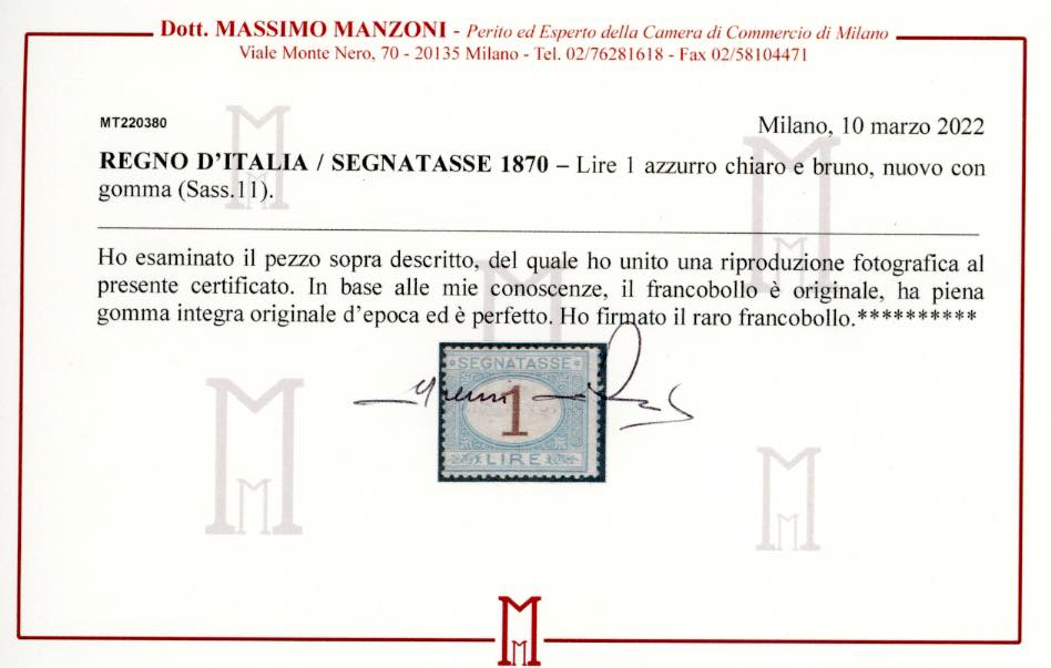 Lotto 1183 - 1870 - 1 lira azzurro chiaro e bruno (11), gomma originale ...