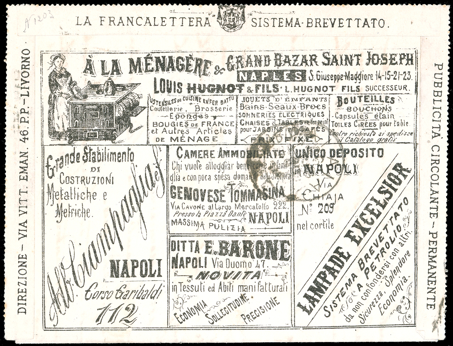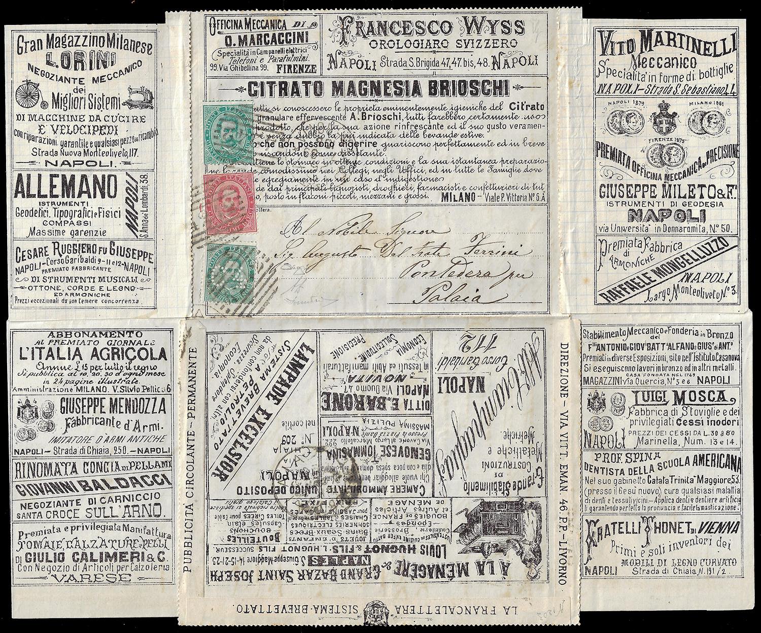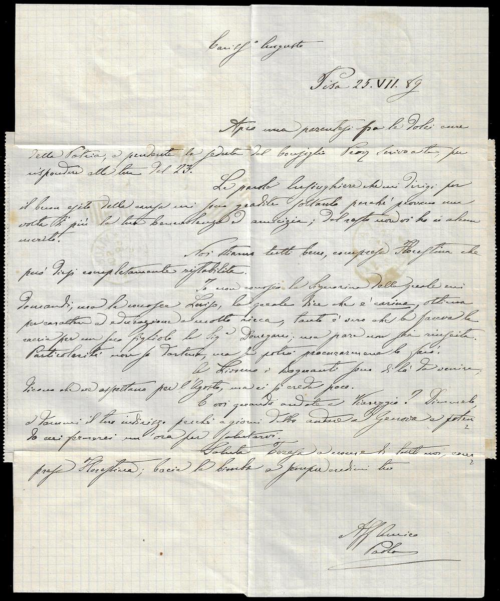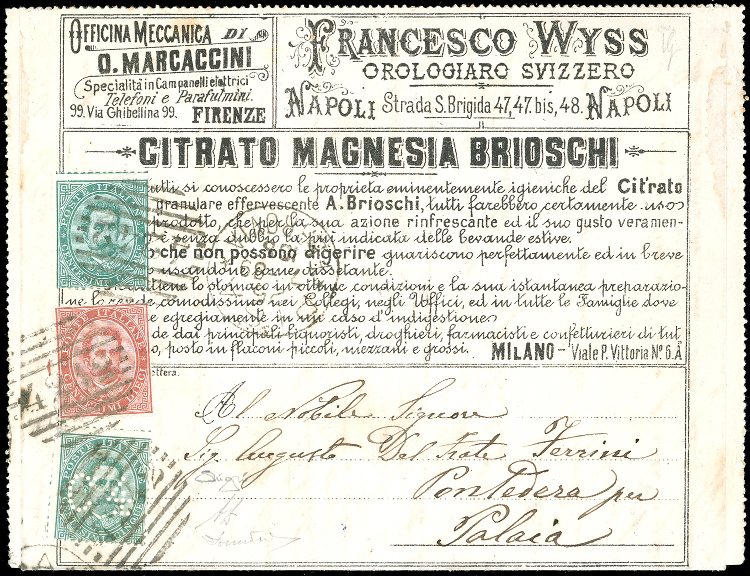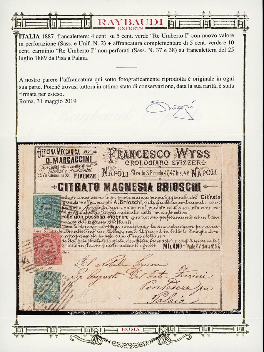 1887 - 4 cent. su 5 cent. Umberto I (2), in affrancatura mista complementare con 5 cent. e 10 cent. Umberto I (37/38), perfetti, su BUSTA FRANCALETTERE da Pisa 25/7/1889 a Palaia. Rara combinazione di valori gemelli, ottima qualità. Cert. Oro Raybaudi, A.Diena e Donnini.