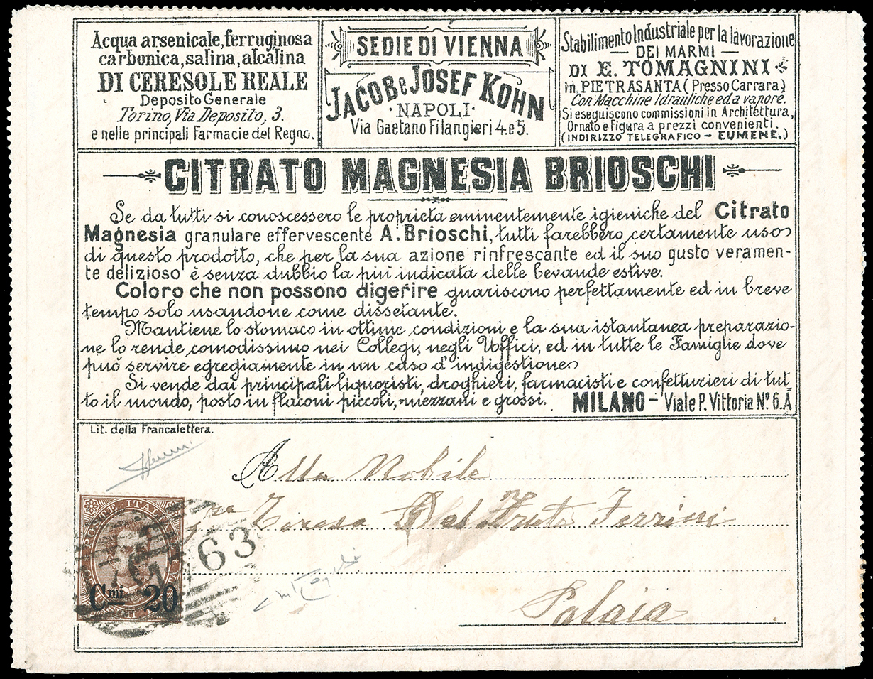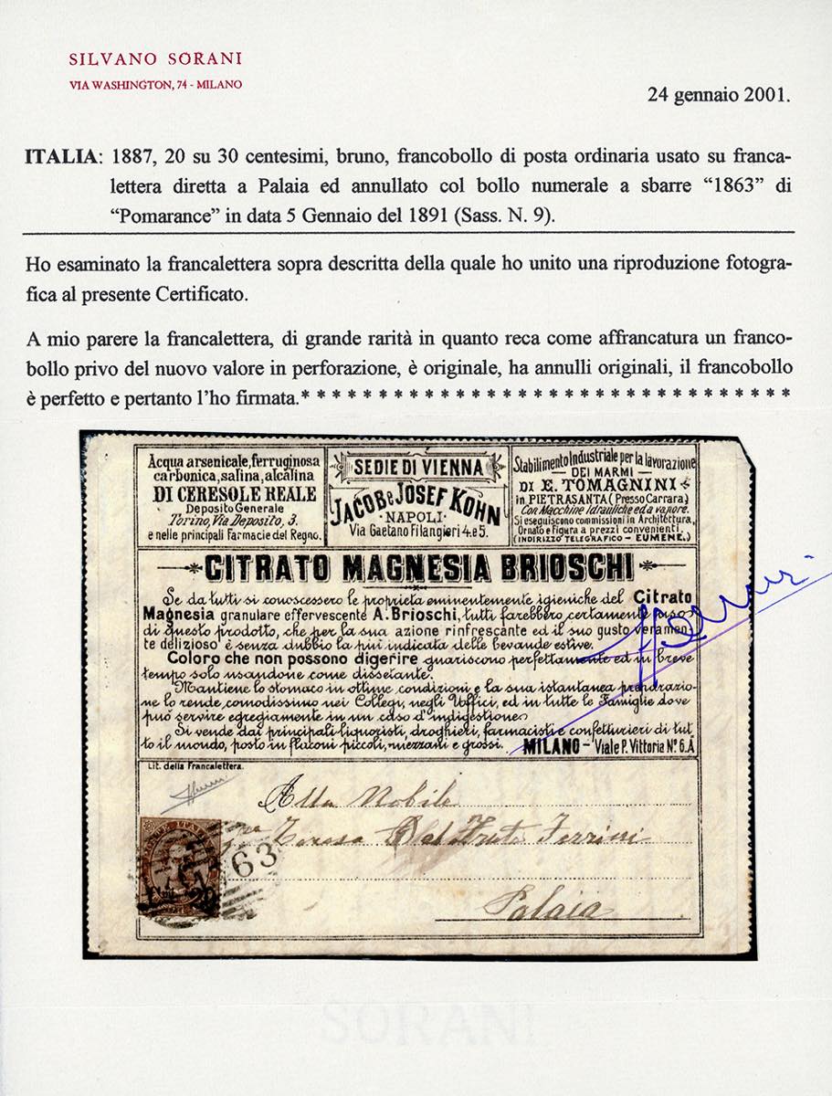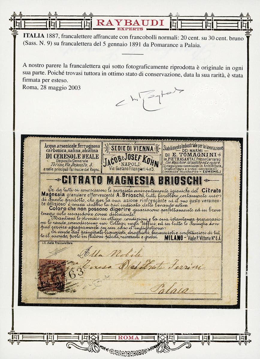 1891 - 20 cent. su 30 cent. soprastampato Umberto I, perfetto, su busta francalettere (9), da Pomarance 5/1/1891 a Palaia. Molto rara e di ottima qualità. Cert. Oro Raybaudi e Sorani.