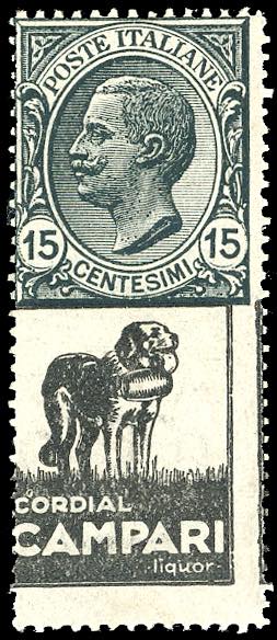 1924 - 15 cent. Cordial Campari, senza spazio tra il francobollo e la vignetta e quest'ultima fortemente spostata a sinistra (3ba), nuovo, ... Leggi tutto