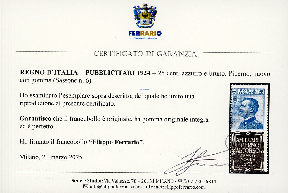 1924 - 25 cent. Piperno (6), nuovo, gomma originale integra, perfetto. Cert. Ferrario.