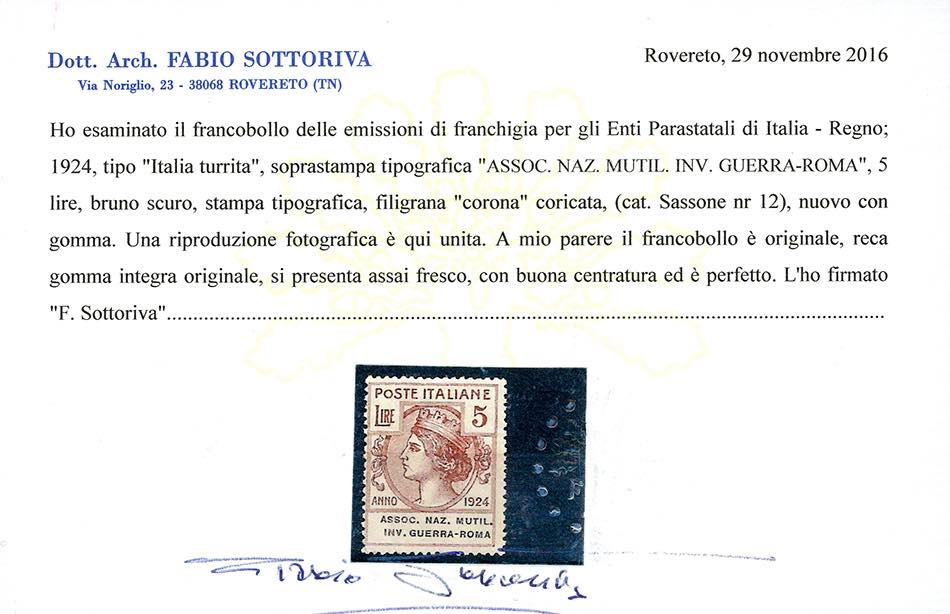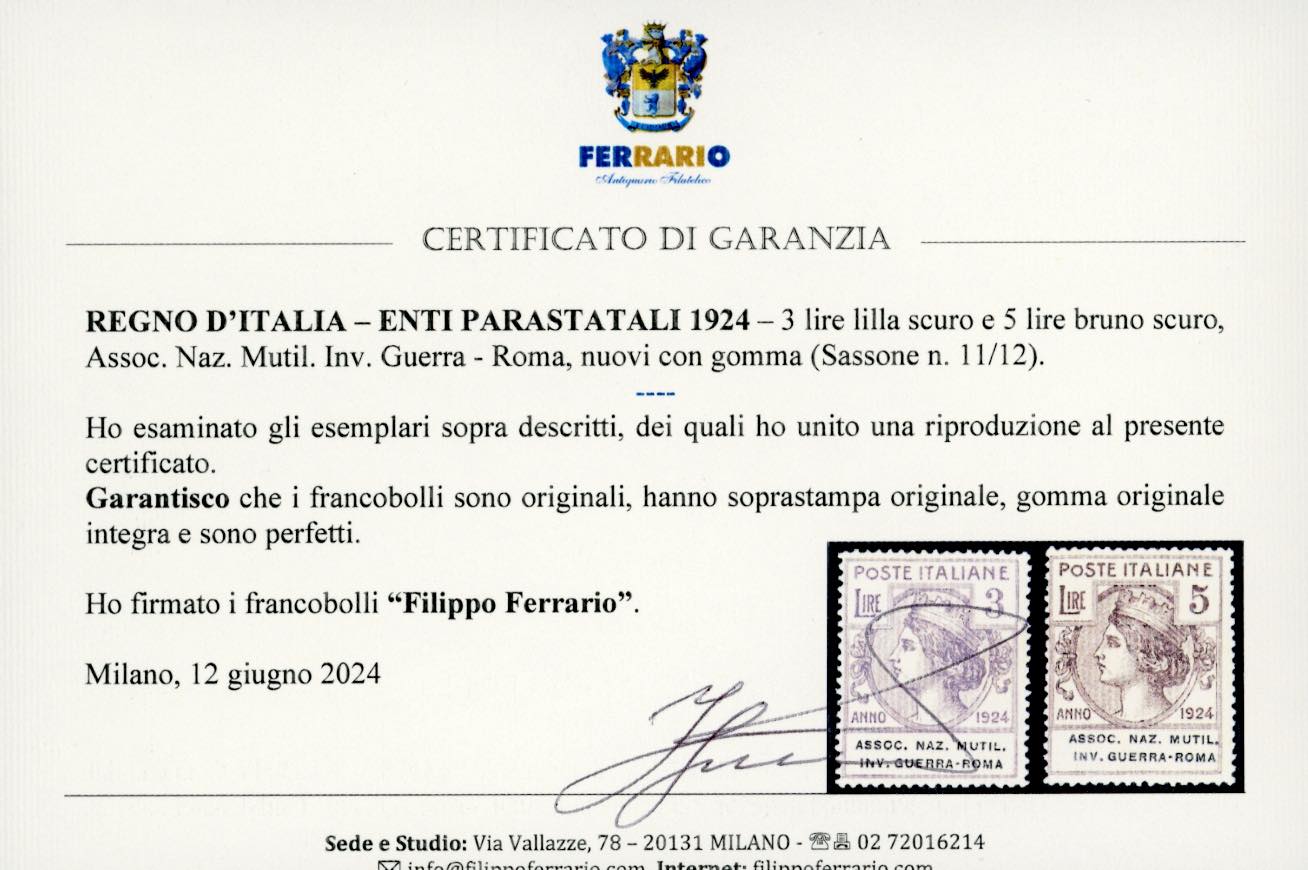 ASSOC.NAZ.MUTIL.INV.GUERRA-ROMA 1924 - Serie completa (5/12), nuovi, gomma originale integra, perfetti. Il 3 lire ottimamente centrato. Alti valori cert. Ferrario.