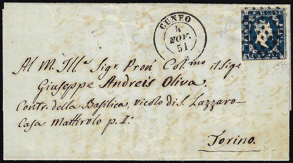 1851 - 20 cent. azzurro scuro, I tiratura, I riporto (2c), perfetto, su sovracoperta di lettera da Cuneo 4/11/1851 a Torino. Bello e raro. ... Leggi tutto