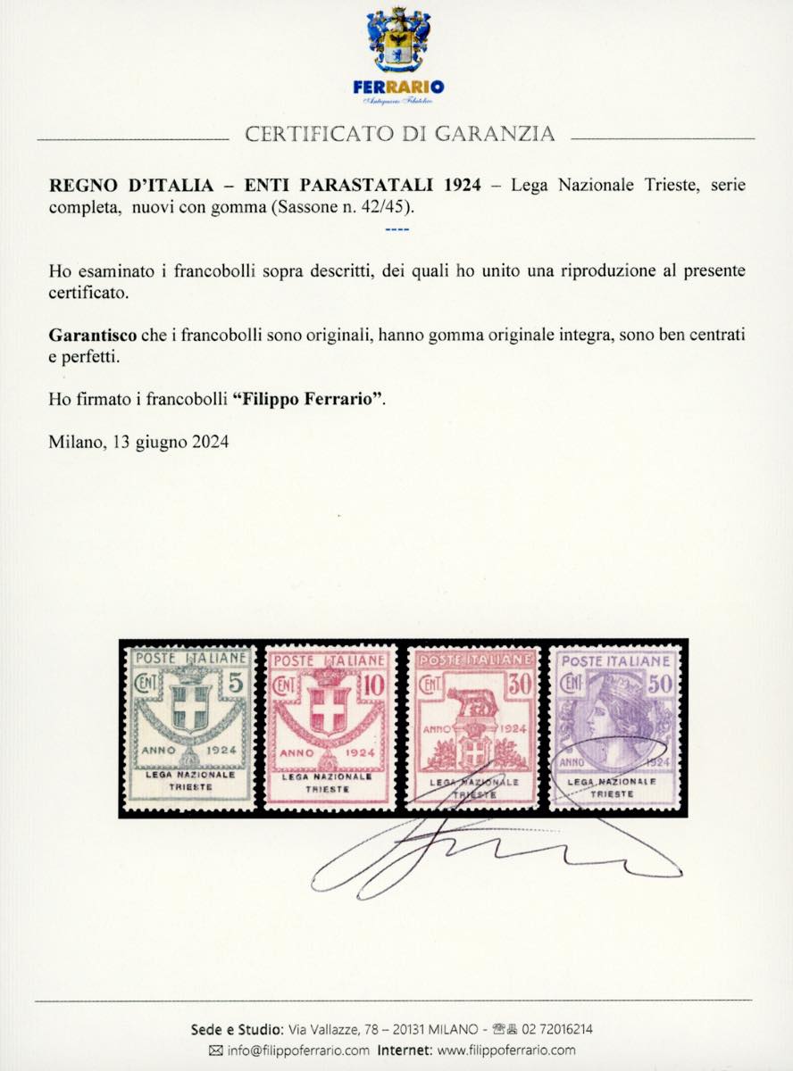 LEGA NAZIONALE TRIESTE 1924 - Serie completa (42/45), ben centrati, gomma originale integra, perfetti. Raybaudi, cert. Ferrario.