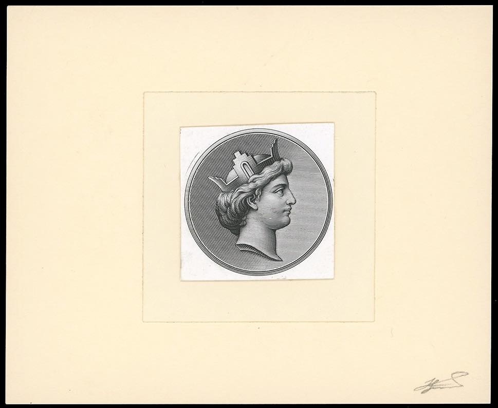 1862ca - Prova di conio raffigurante l'Italia Turrita, probabimente utilizzata per produzioni numismatiche, su cartoncino patinato, montata con passe-partout. Interessante. Ferrario.