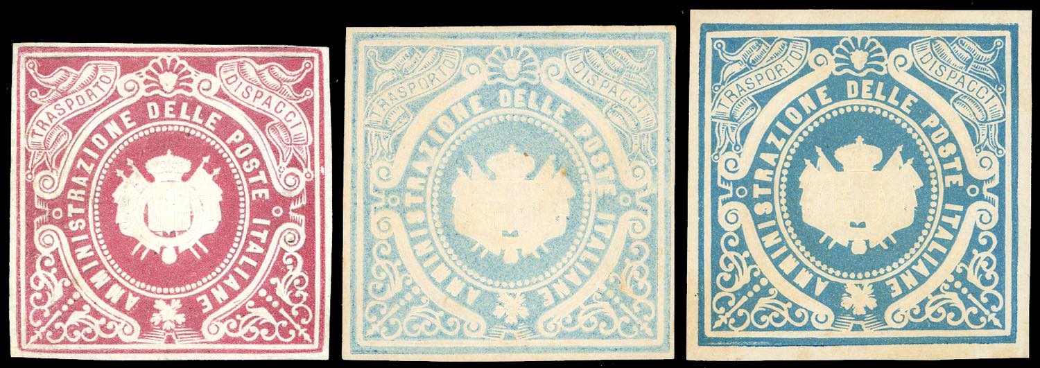 1864 - Saggi Re, tre esemplari in colori differenti con Stemma Sabaudo al centro e indicazione "Trasporti dispacci", senza indicazioni del valore, senza gomma come sempre, perfetti. Ferrario.
