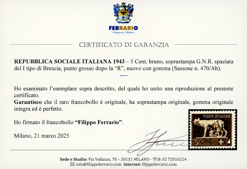 1943 - 5 cent., soprastampa G.N.R. spaziata del I tipo di Brescia, punto grosso dopo la "R" (470/Ab), nuovo, gomma originale integra, perfetto. Raro. Raybaudi, cert. Ferrario.