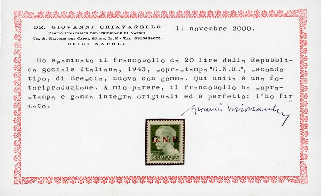 1943 - 20 lire soprastampa G.N.R. di Brescia, II tipo (487/II), gomma originale integra, perfetto. Raro. G.Oliva, Raybaudi, Fiecchi, cert. Chiavarello e Ferrario.