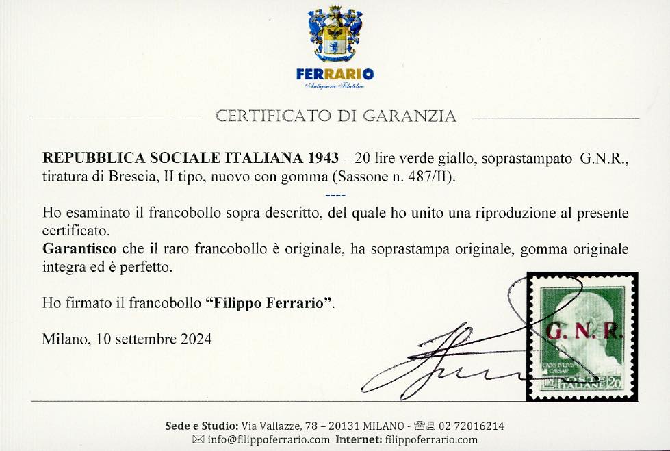 1943 - 20 lire soprastampa G.N.R. di Brescia, II tipo (487/II), gomma originale integra, perfetto. Raro. G.Oliva, Raybaudi, Fiecchi, cert. ... Leggi tutto