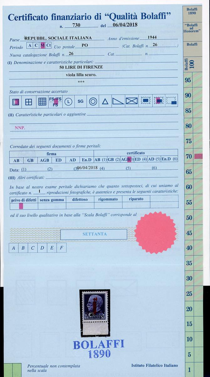 Lotto 1370 - 1944 - 50 lire soprastampato fascio in lilla, tiratura di ...