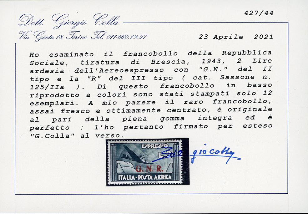 1943 - 2 lire ardesia, soprastampa G.N.R. di Brescia, "G.N." del II tipo e "R." del III tipo (125/Iia), nuovo, gomma originale integra, perfetto. Molto raro, tiratura 12 esemplari. Fiecchi, cert. Colla.