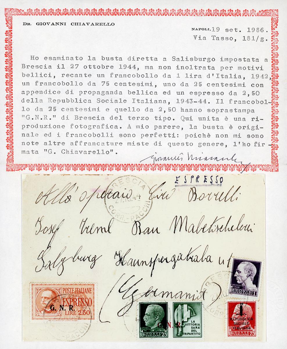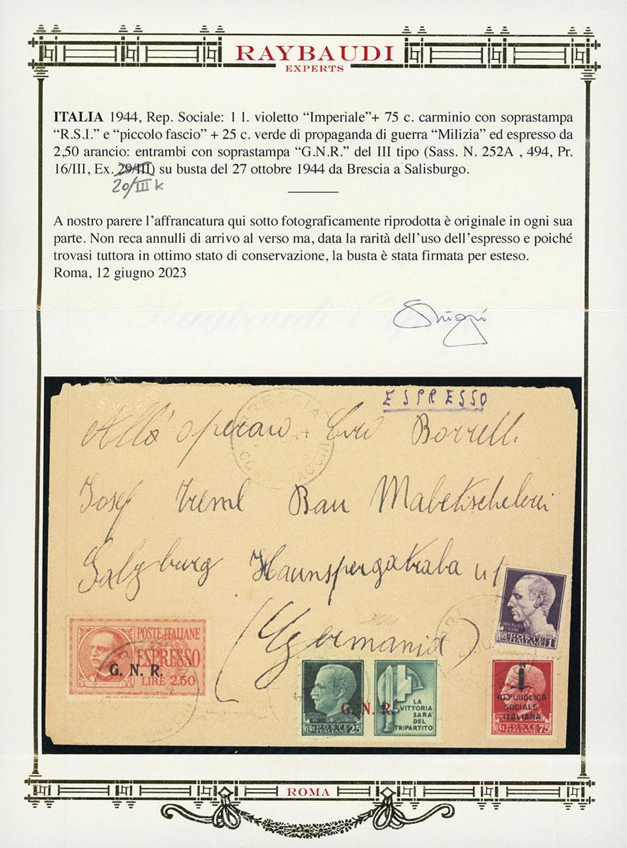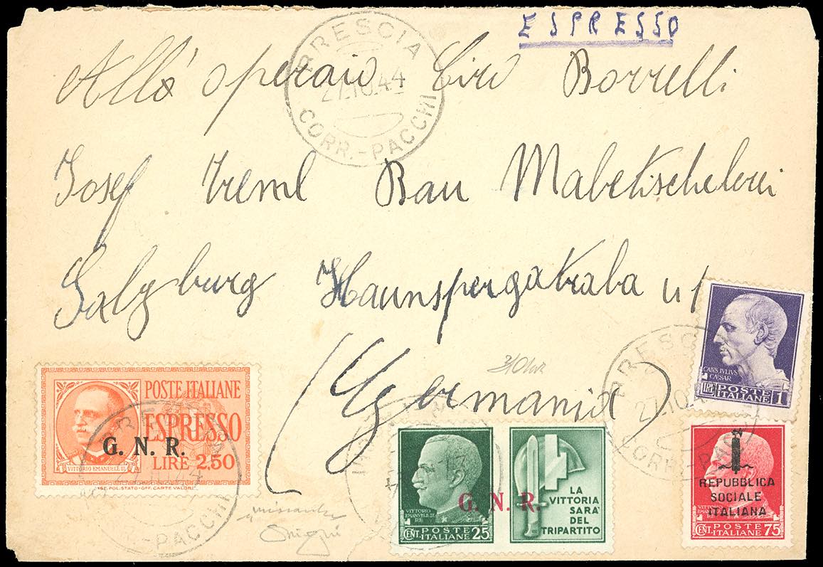 1944 - 2,50 lire soprastampa G.N.R. di Brescia, III tipo, punto piccolo dopo la "R", 25 cent. Milizia, soprastampa G.N.R. di Brescia III tipo, 1 lira Imperiale, 75 cent. soprastampato fascetto (E20/IIIK,16/III,252A,494), perfetti, su busta da Brescia 27/10/1944 a Salisburgo, in Germania, non recapitata a causa degli eventi bellici. Molto raro l'uso dell'espresso su lettera. Cert. Oro Raybaudi e Chiavarello.
