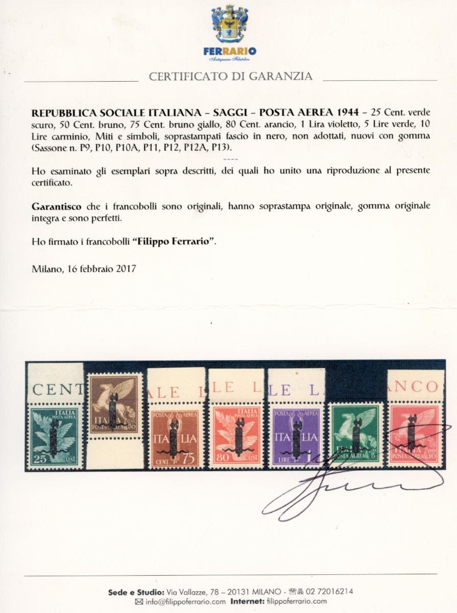 POSTA AEREA 1944 - Soprastampati fascio grande in nero, serie completa (P9/P13), gomma originale integra, perfetti. Molto belli! Cert. Ferrario.