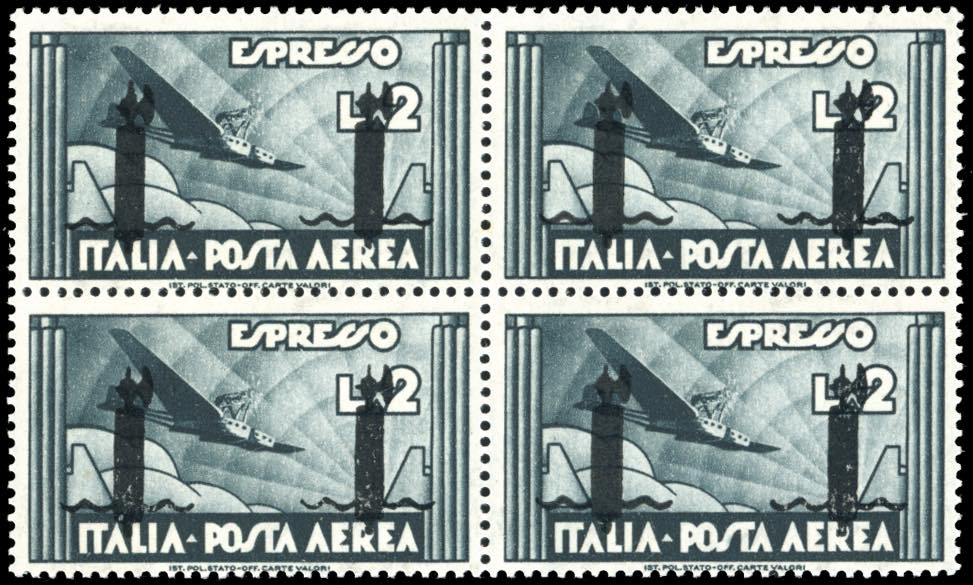 POSTA AEREA 1944 - 2 lire ardesia, soprastampa fascio in nero ripetuta due volte (P16), blocco di quattro, gomma originale integra, ... Leggi tutto