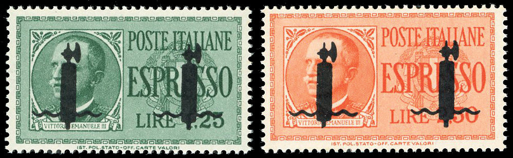 ESPRESSI 1944 - Soprastampati fascio in nero ripetuto due volte (P1/P2), gomma integra, perfetti. Cert. Oro Raybaudi.