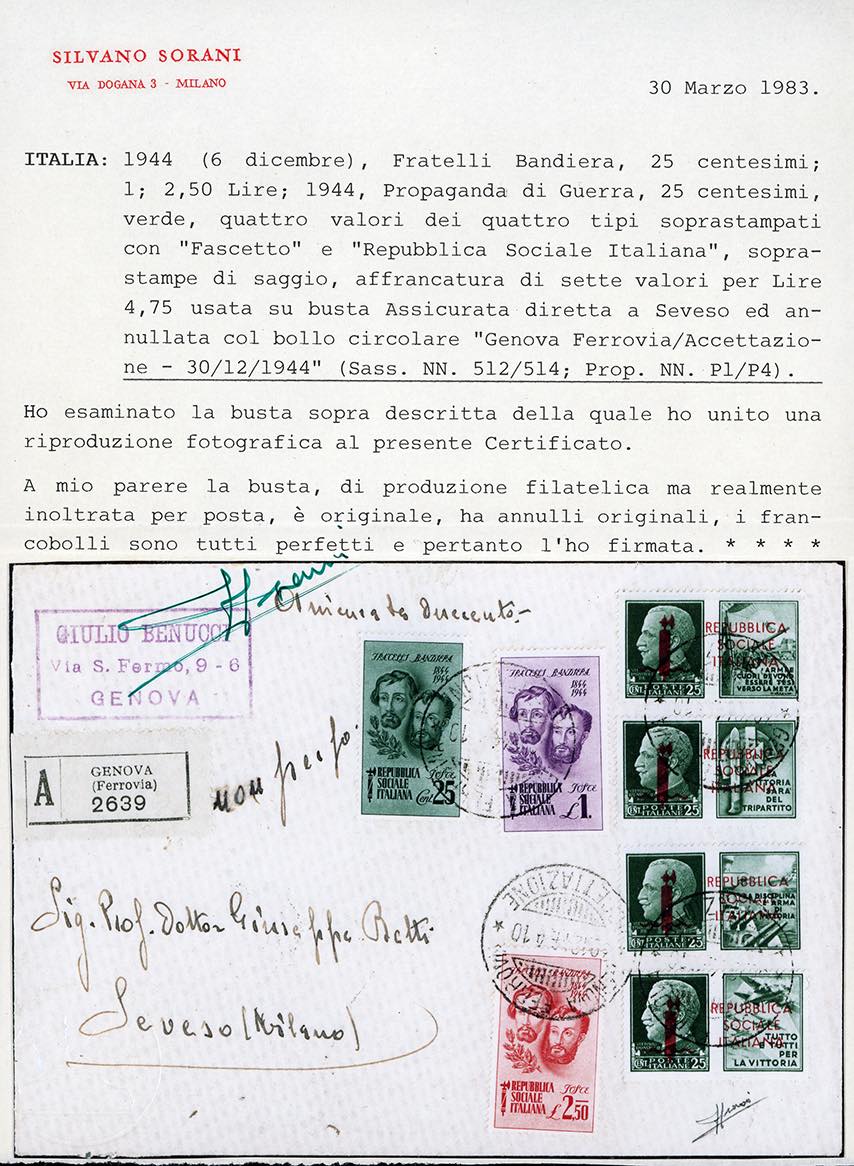 PROPAGANDA DI GUERRA 1944 - 25 cent. soprastampati "fascetto" e "Repubblica Sociale Italiana", serie completa, Fratelli Bandiera, serie completa (P1/P4,512/514), perfetti, su busta assicurata da Genova 30/12/1944 a Seveso, bolli di transito e di arrivo al verso. Rarissima. Cert. Sorani.