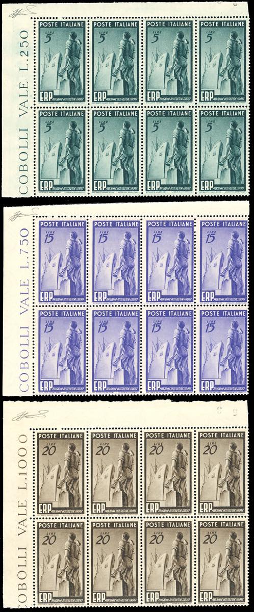 1949 - ERP, serie compelta (601/603), blocchi di otto, angolo di foglio, nuovi, gomma originale integra, perfetti. Ferrario.