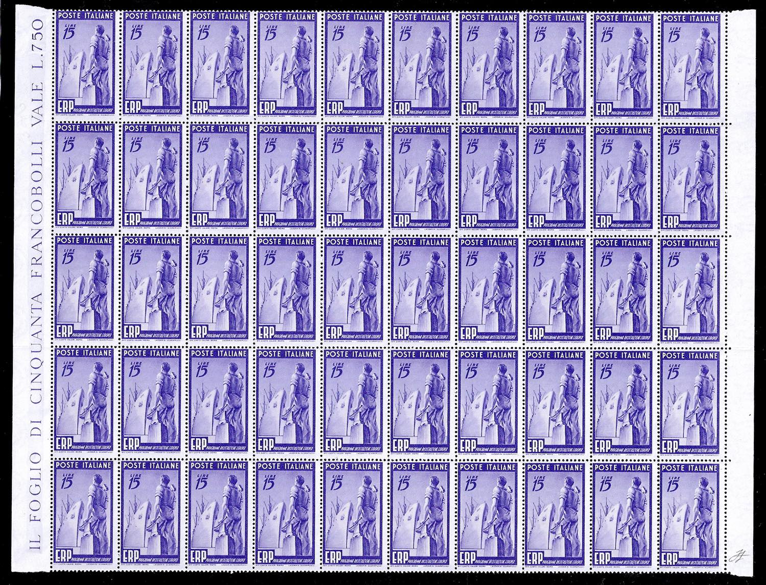 1949 - ERP, serie completa (601/603), fogli di 50 esemplari nuovi, gomma originale integra, perfetti e molto freschi. Il 15 lire privo del margine superiore e inferiore. Gli esemplari ben centrati conteggiati come normali. Ferrario.