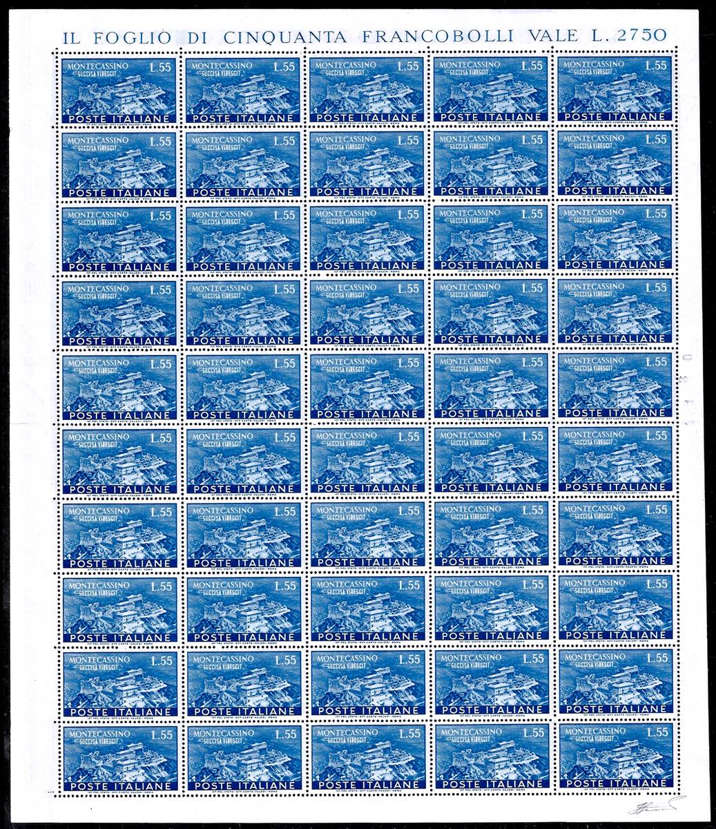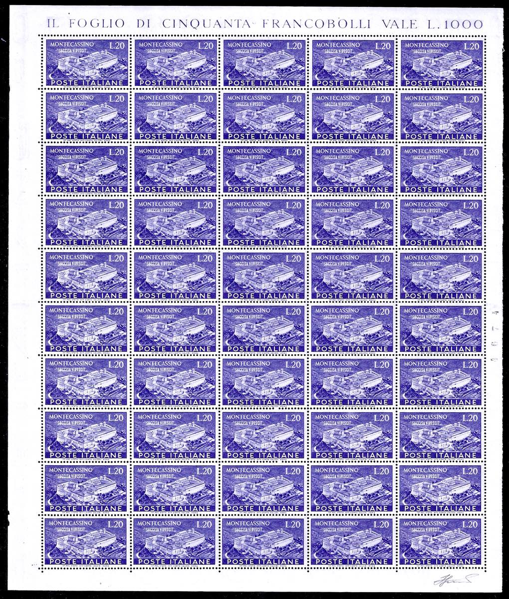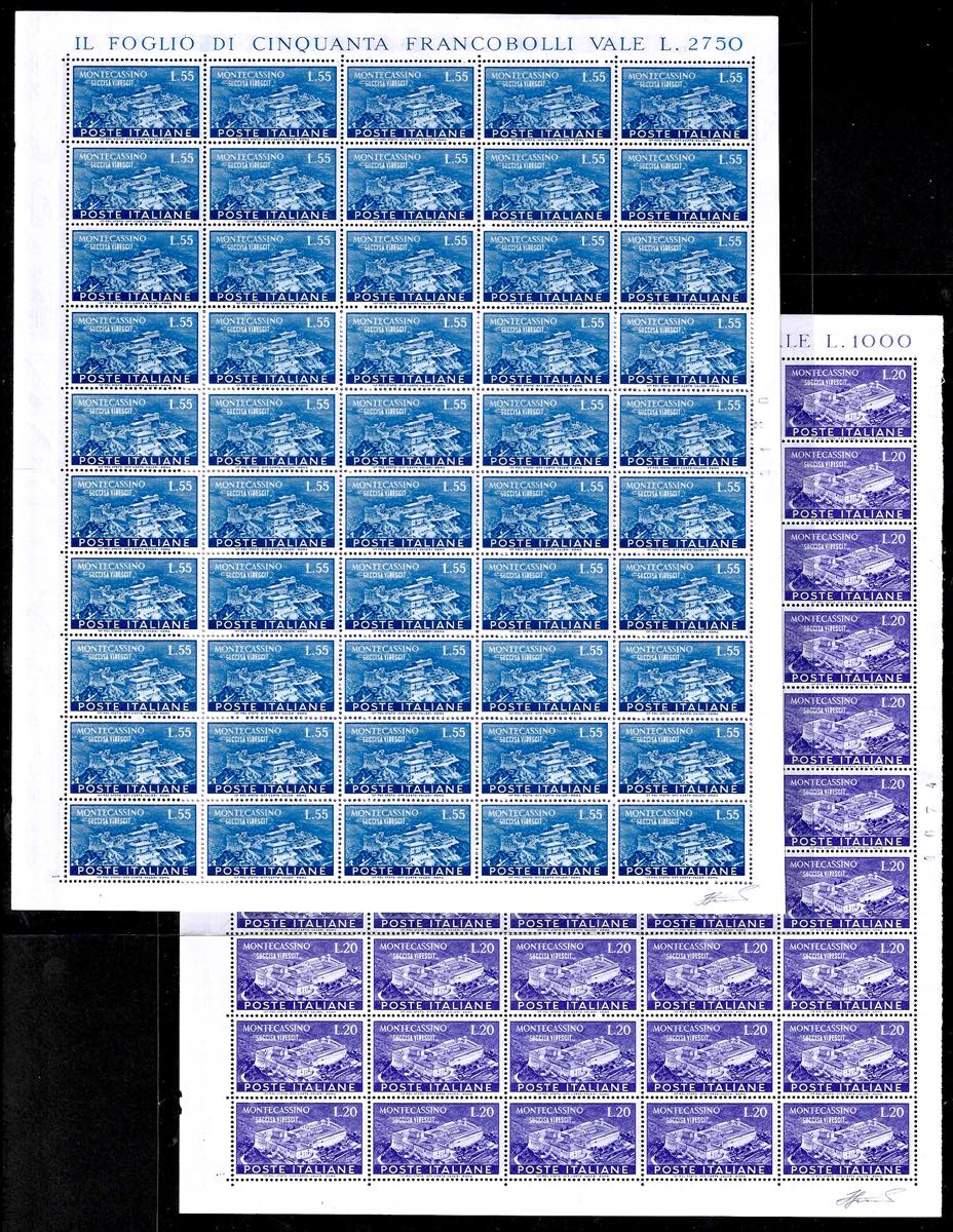 1951 - Montecassino, serie completa (664/665), fogli nuovi di 50 esemplari, gomma originale integra, perfetti e ben centrati. Bellissimi. ... Leggi tutto