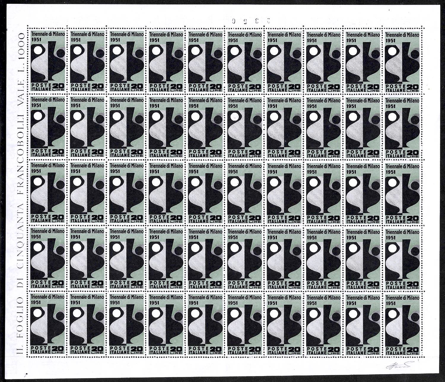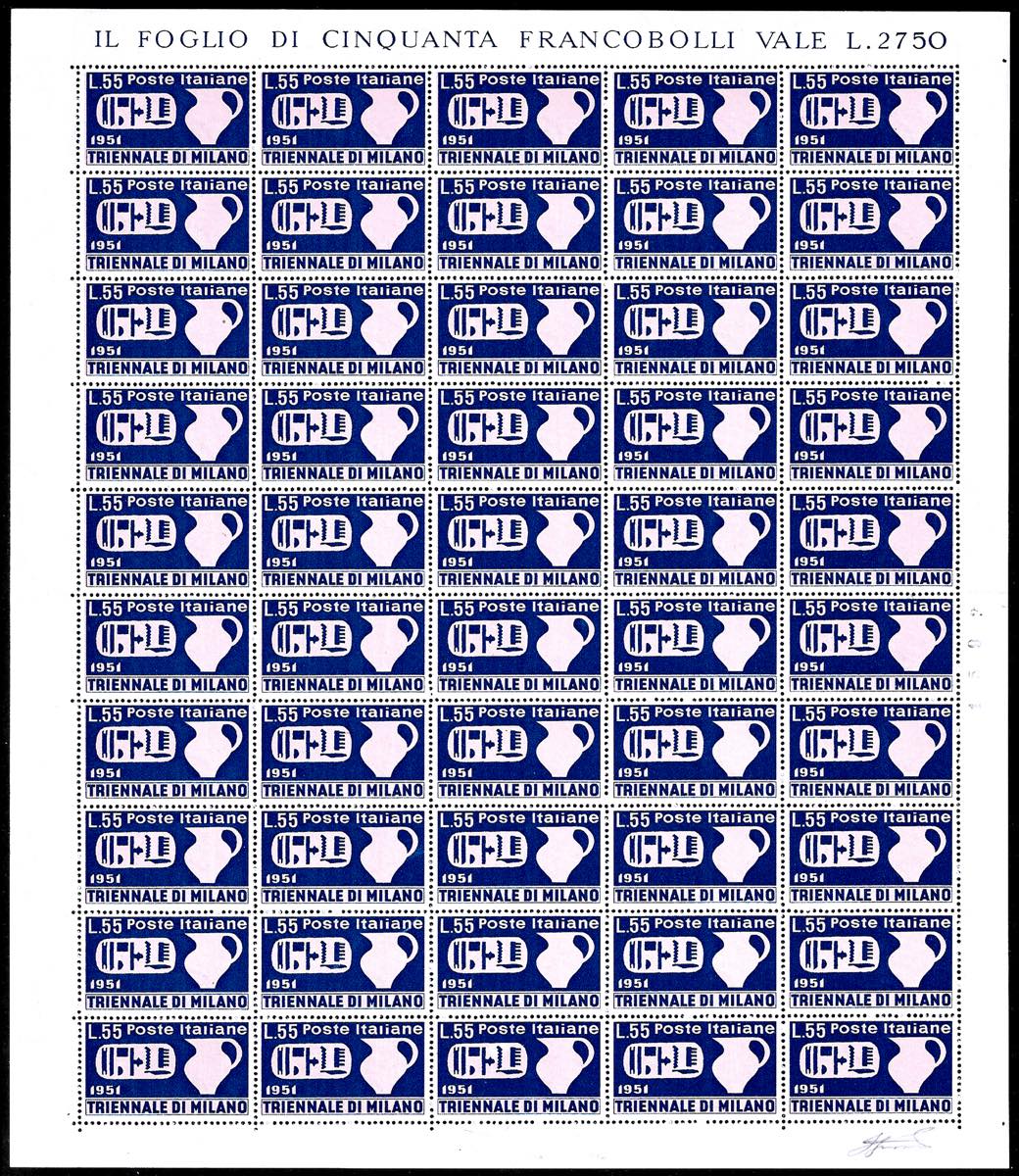 1951 - Triennale di Milano, serie completa (666/667), fogli nuovi di 50 esemplari, gomma originale integra, perfetti e ben centrati. Bellissimi. Ferrario.