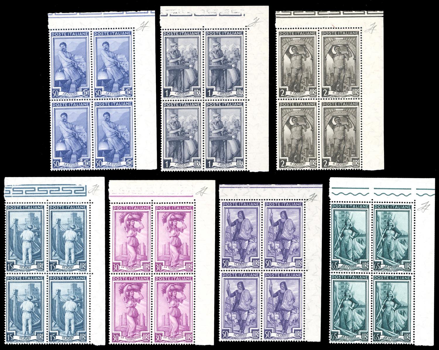1955/57 - Lavoro, filigrana stelle, serie completa (754/760), blocchi di quattro, angolo di foglio, nuovi, gomma originale integra, perfetti. Ferrario.