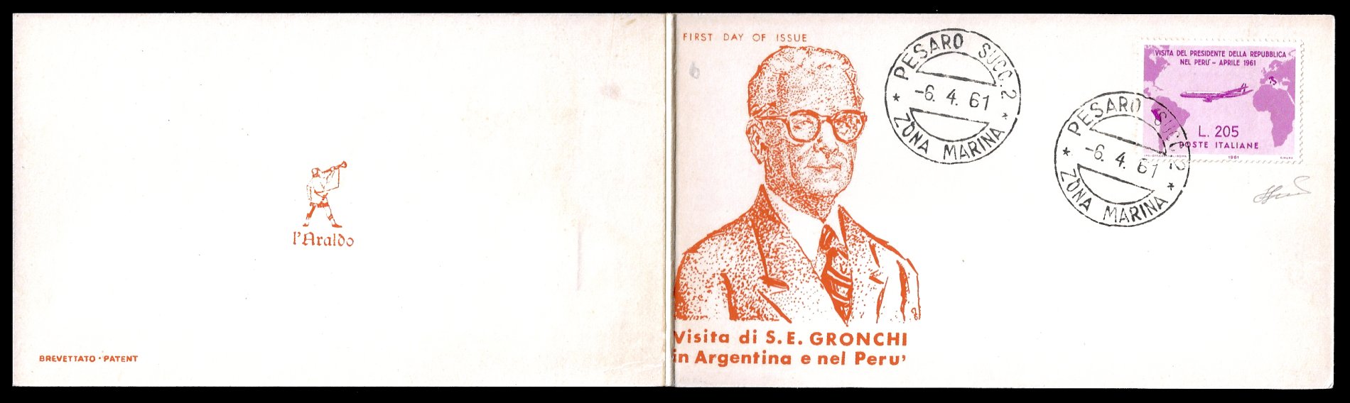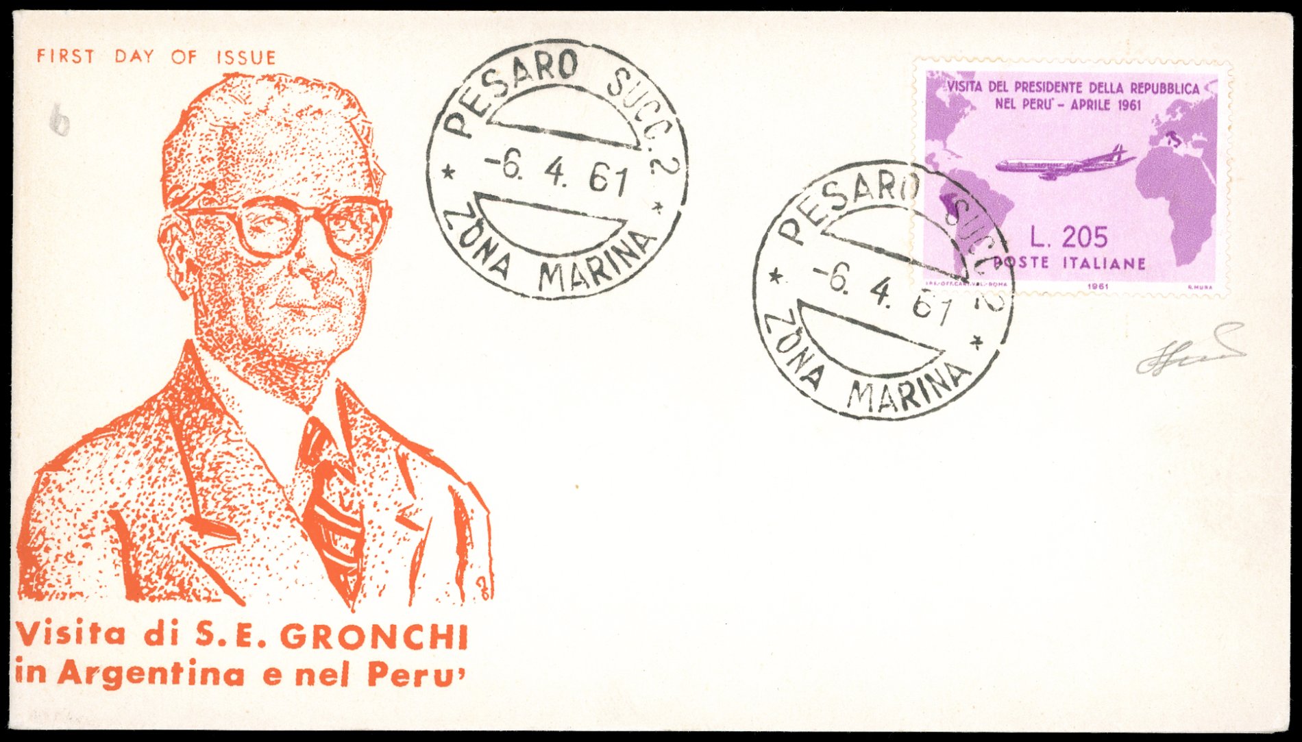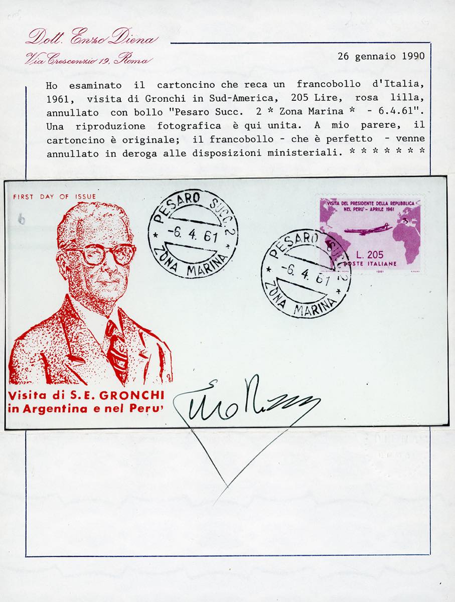 1961 - 205 lire Gronchi rosa (921), perfetto, usato su cartoncino speciale celebrativo, annullato a Pesaro 6/4/1961. Insieme non comune. Ferrario, cert. E.Diena.