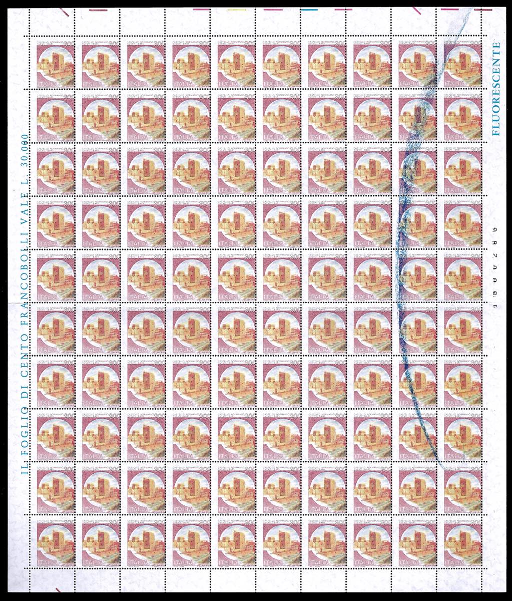 1980 - 300 lire Castelli (1518), dentellatura verticale fortemente spostata a sinistra, foglio completo di 100 esemplari, nuovo, gomma originale integra, perfetto, segno di biffatura su 10 esemplari.