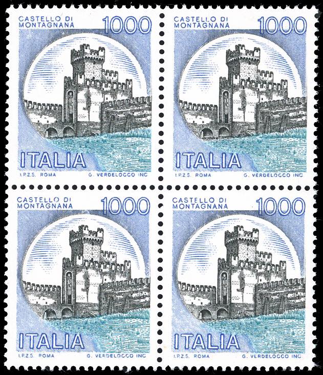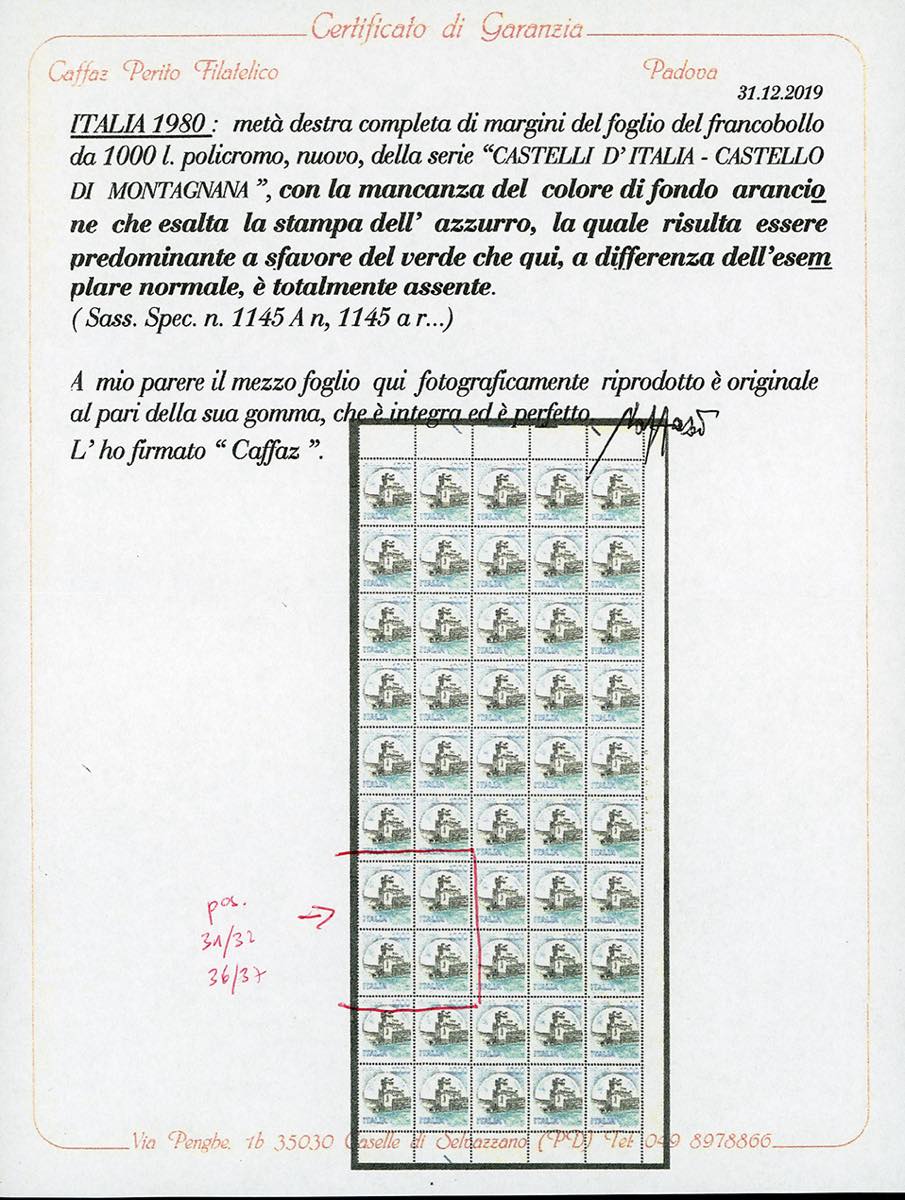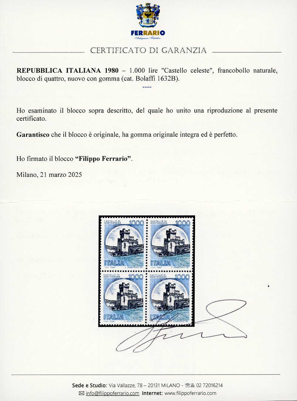 1980 - 1.000 lire "Castello celeste", francobollo naturale (cat.Bolaffi 1632B), blocco di quattro, nuovo, gomma originale integra, perfetto. Raro. Cert. Ferrario, fotocopia cert. Caffaz del blocco di provenienza.
