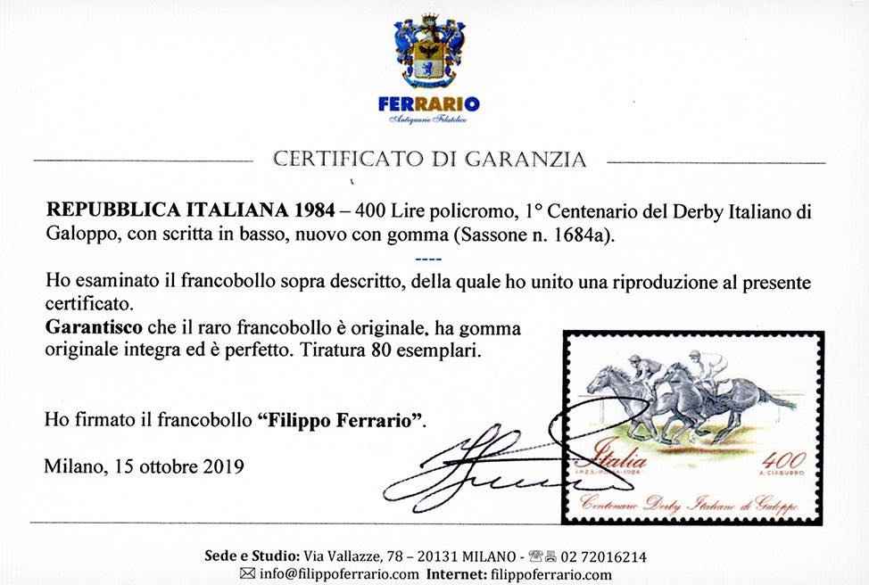 1984 - 400 lire Derby in pista, scritte in basso, francobollo naturale (1684a,cat.Bolaffi 1794B € 22.000), gomma originale integra, perfetto. Raro, tiratura presunta 90 esemplari. Cert. Ferrario.