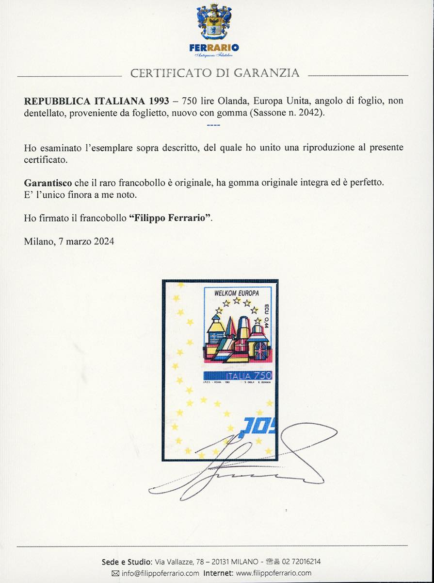 1993 - 750 lire Olanda, Europa Unita, non dentellato, proveniente da foglietto (2042), nuovo, angolo di foglio, gomma originale integra, perfetto. Rarissimo, probabilmente unico e non catalogato. Cert. Ferrario.