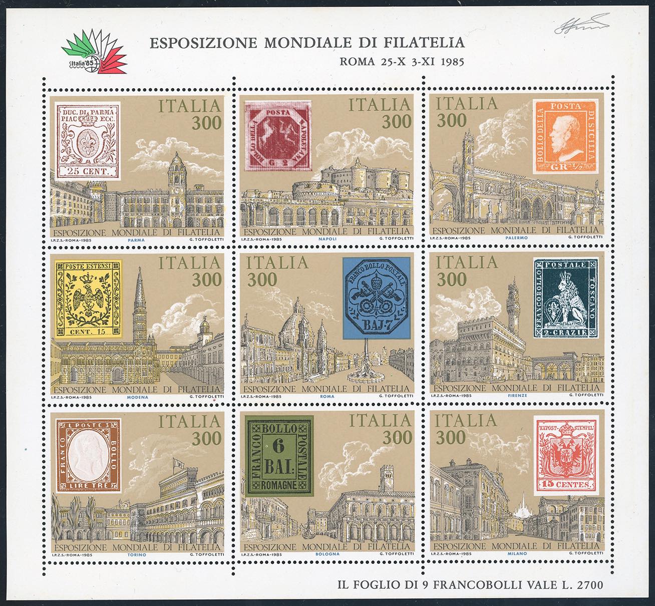 1985 - 300 lire Italia '85, foglietto, doppia stampa del francobollo di Toscana (2aaa), gomma originale integra, perfetto. Raro. Cert. Ferrario.