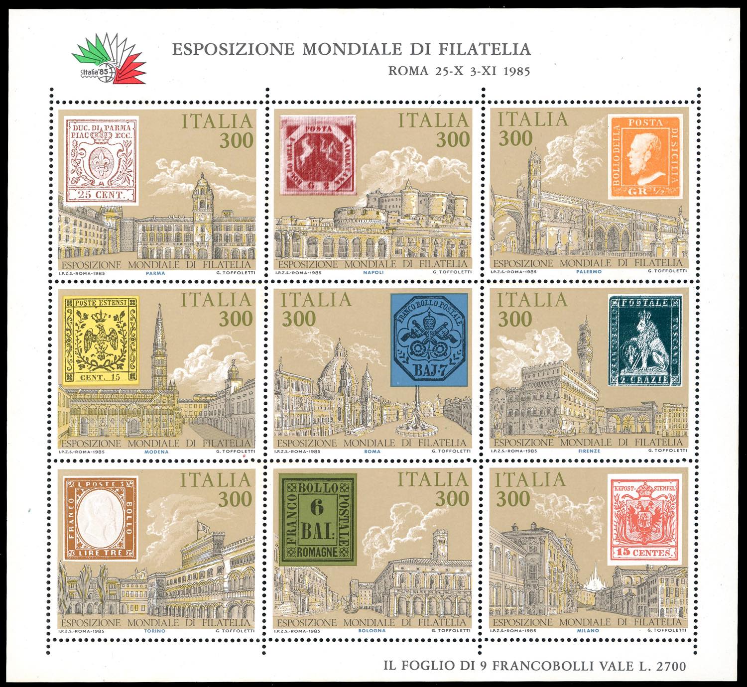 1985 - Italia'85, foglietto, evidente e nitida doppia stampa sul francobollo di Toscana, meno marcata su quello di Napoli (2aaa), nuovo, ... Leggi tutto