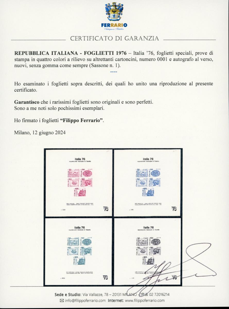 1976 - Italia'76, foglietti speciali (1), prove di stampa in quattro colori differenti a rilievo su altrettanti cartoncini, non gommati come sempre, numero 0001 e autografo al verso, perfette e di splendida qualità. Estremamente rare, pochissime esistenti. Cert. Ferrario.