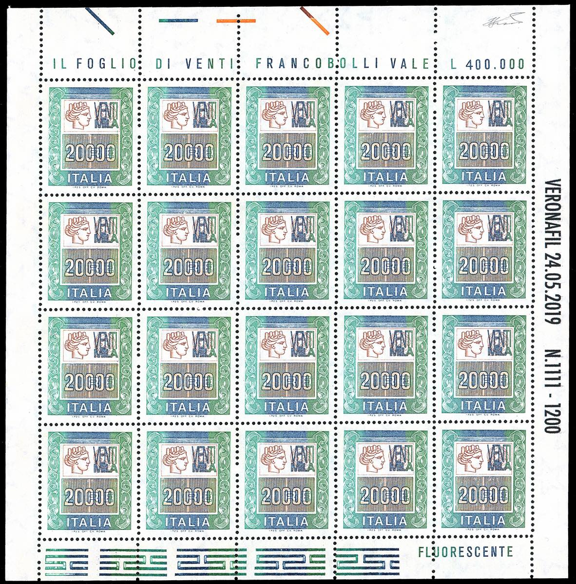 2019 - 20.000 lire Alti valori (1442B), minifoglio di 20 esemplari soprastampato "Veronafil 24.05.2019" e numerato, nuovo, gomma originale ... Leggi tutto